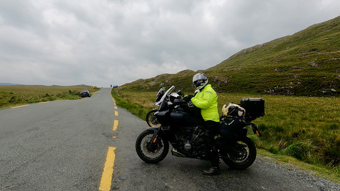 Zu Beginn durchfahren wir den Connemara Nationalpark – die Landschaft wird zunehmend hügeliger. Wir umrunden den Killary Fjord bei grauem, wolkigem Himmel, doch es bleibt trocken. Die Natur ist sattgrün, der Wind stark – schade nur, dass die Sonne fehlt. Weiter geht’s durchs Doolough Valley, vorbei an einem beeindruckenden Bergsee. Überall Schafe, auch mitten auf der Straße – also Vorsicht! Auf schmalsten Wegen queren wir den Nephin Nationalpark. Die Weite und der raue Wind erinnern uns an Patagonien. Wir übernachten in Belmullet im Westen des Countys Mayo am Zugang zur Halbinsel An Muirthead.