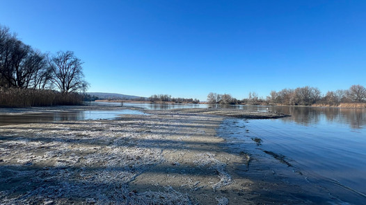 Klares, kaltes Sonnenwetter begleitet uns dabei. Der Rhein führt wenig Wasser und gibt ungewohnte Einblicke frei, die neue Perspektiven eröffnen.